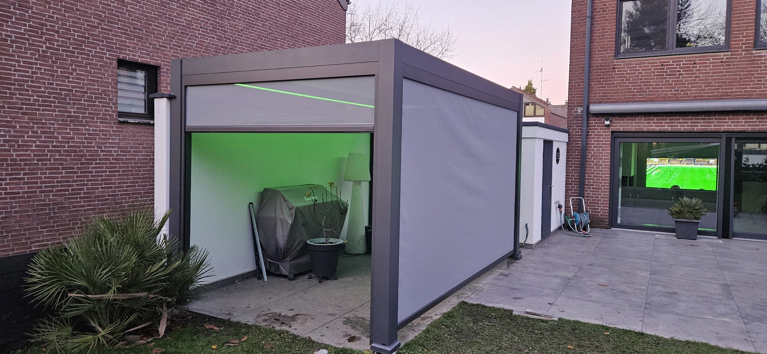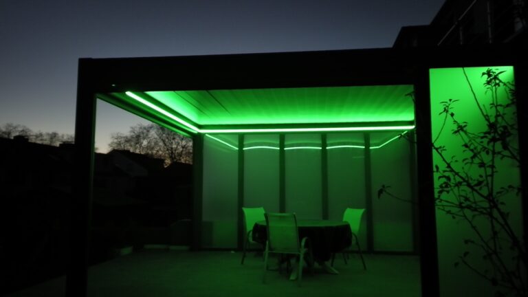 Dank integrierter LED-Ambientebeleuchtung, RGBW-Lichtoption und automatischem Regensensor bleibt der Terrassenbereich komfortabel nutzbar und geschützt – bei wechselnden Wetterbedingungen und zu jeder Tageszeit.