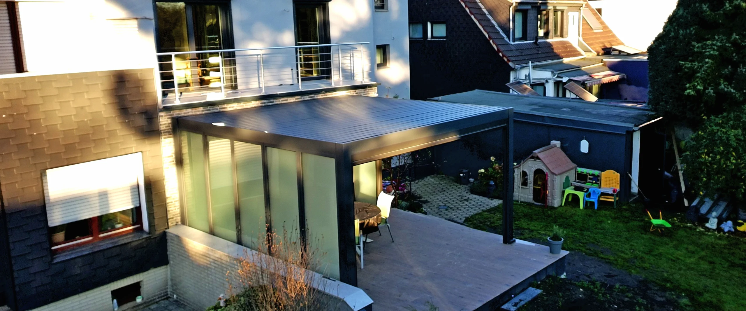 Bei diesem Projekt wurde eine maßgefertigte Pergola Stella Sky Classic harmonisch in die bestehende Terrassenstruktur eines Doppelhauses integriert.
